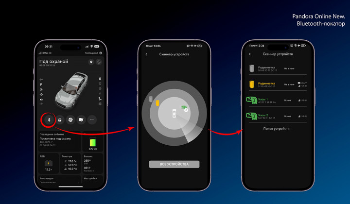Изменения коснулись и работы смартфона с системами Pandora по Bluetooth-каналу: в интерфейсе Pandora Online пользователь теперь может видеть абсолютно все прописанные в базовый блок Bluetooth-аксессуары Pandora, расположенные в зависимости от радиуса действия беспроводного соединения, с информацией о серийном номере устройства, уровне сигнала и состоянии элемента питания.