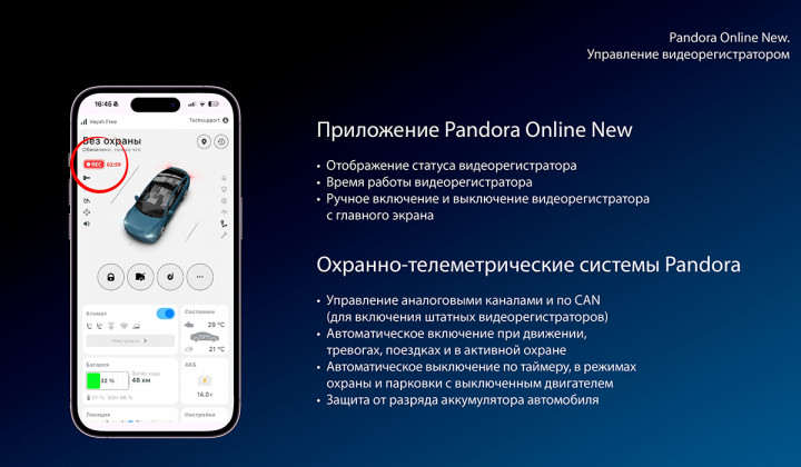 Была серьезно модернизирована как на сервере, так и в мобильном приложении логика работы с автомобильным видеорегистратором. На главном экране приложения появилась иконка статуса видеорегистратора, с отображением времени работы при включенном состоянии, которая также служит кнопкой включения/выключения регистратора. Управление камерой теперь реализовано не только по аналогу, но и непосредственно по цифровым шинам CAN, позволяя автоматически активировать запись при поездке, а также записать тревожное или иное событие в режиме активной охраны и, при этом, не посадить аккумулятор: при включении видеорегистратора с кнопки мобильного приложения предусмотрено его автоматическое выключение по истечению 24 часов непрерывной работы.